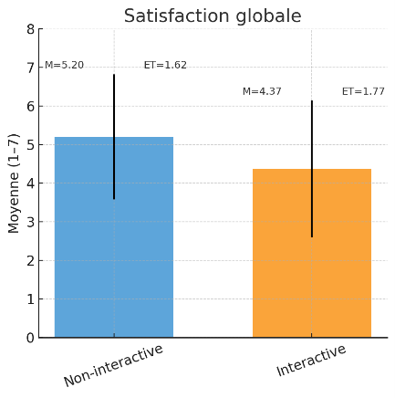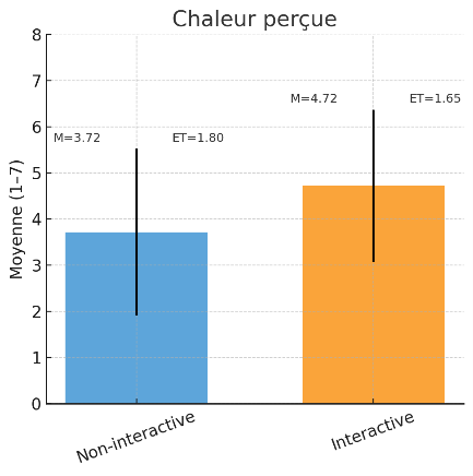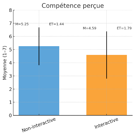 Los resultados muestran contrastes interesantes: las salas interactivas se consideran más acogedoras, pero las salas no interactivas parecen más competentes y, en última instancia, generan una mayor satisfacción. A continuación, se presentan los resultados con la media (M) y la desviación estándar (SD) para reflejar tanto el nivel general como la dispersión de las respuestas. En términos de calidez percibida, la sala interactiva tiene una clara ventaja (M = 4,72; SD = 1,65) en comparación con la sala no interactiva (M = 3,72; SD = 1,80). Los participantes describen el ambiente como más agradable y acogedor cuando el espacio fomenta la interacción. En cuanto a la competencia, ocurre lo contrario: la sala no interactiva recibe una valoración más positiva (M = 5,25; SD = 1,44) que la sala interactiva (M = 4,59; SD = 1,79). Por lo tanto, la disposición sobria y distante parece transmitir una imagen de seriedad y profesionalidad. Por último, la satisfacción general también es mayor en la sala no interactiva (M = 5,20; SD = 1,62) que en la sala interactiva (M = 4,37; SD = 1,77). La privacidad y la tranquilidad parecen tener más peso que la cordialidad cuando se trata de proyectarse en un contexto médico.