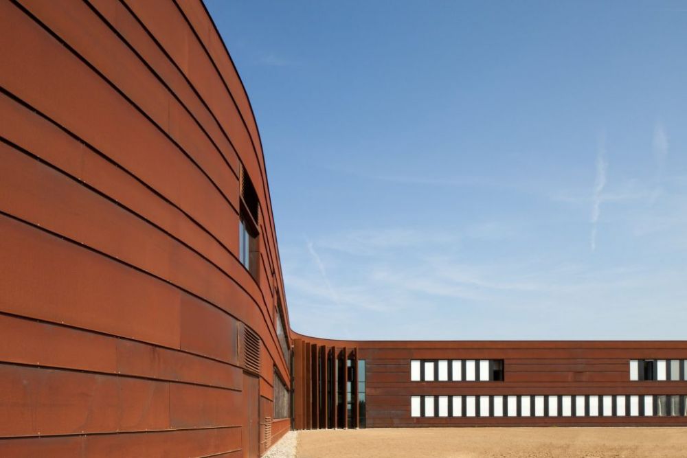 D’une géométrie courbe, compacte, épousant naturellement le relief du site, les deux bâtiments principaux sont en forme de S, reliés au centre par un hall qui dessert toutes les fonctions permettant aux lycéens et équipes pédagogiques un gain de confort et une facilité de déplacement.